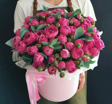 Букет в сиреневых цветах, собранный из брасики, лизиантусов и роз. Добавлены зелень эвкалипта и упаковка.